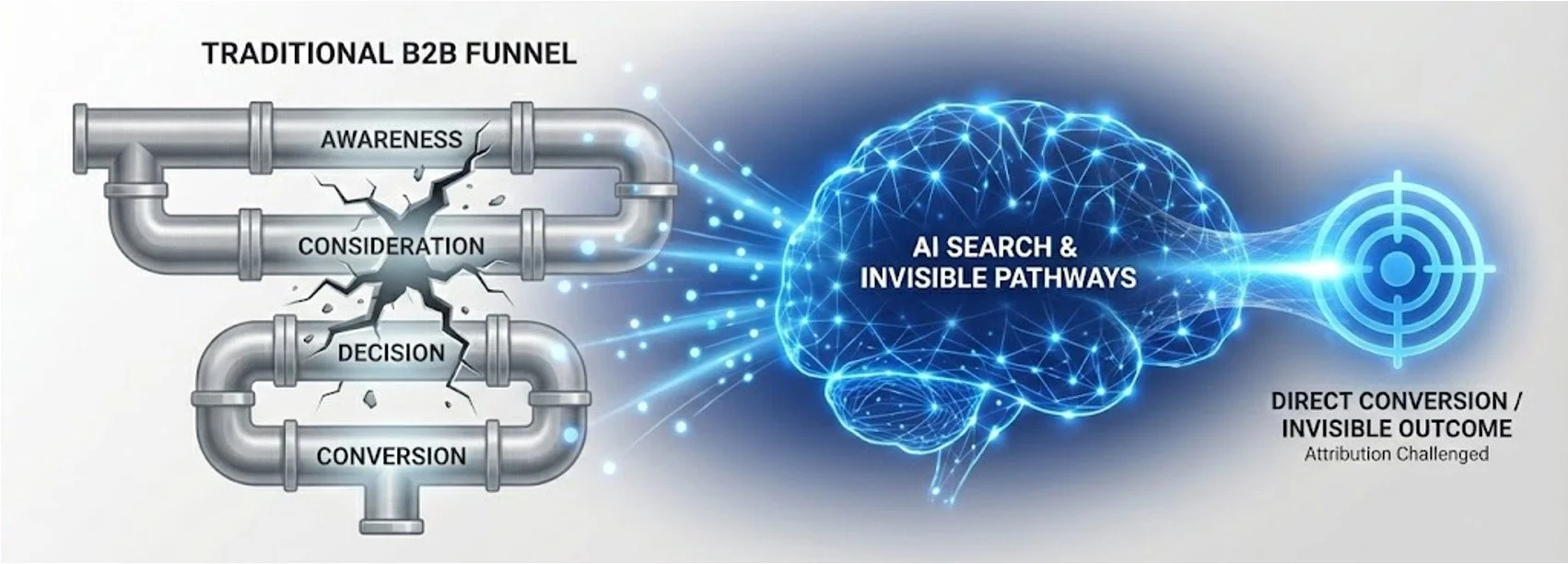 B2B marketers are witnessing a fundamental shift in how buyers discover and engage with content. The familiar marketing funnel, where prospects move from awareness to consideration to decision through trackable touchpoints, seems to be vanishing. But is the funnel truly broken, or has it simply gone “invisible”?